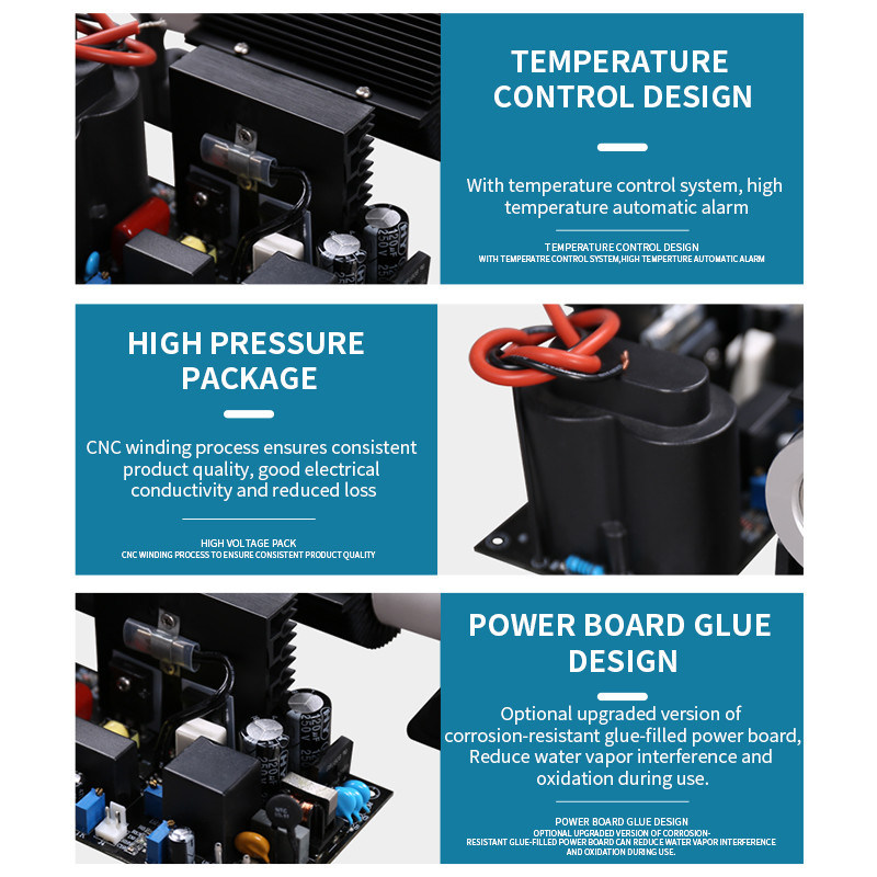 2. Làm mát bằng không khí cho các điện cực bên trong và bên ngoài với nhiệt độ tăng thấp khi làm việc liên tục, hiệu quả cao và sản lượng ozone ổn định.